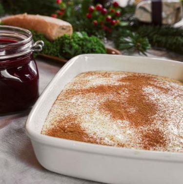 2. Pisk fløden og vend den i. Smag til med sukker og vaniljesukker. Ved servering strøs lidt kanel over.