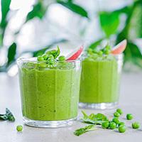 1. Mix de optøede ærter med de udhulede og hakkede avokado, spinat, æblejuice og presset lime til en blød smoothie.