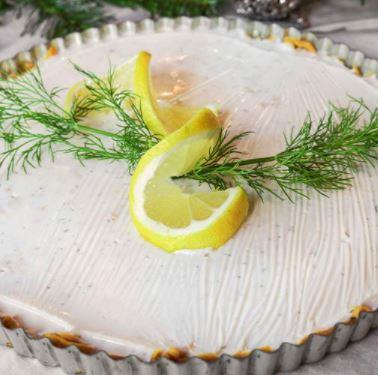 Pynt tærten med frisk dild og citronskiver.
